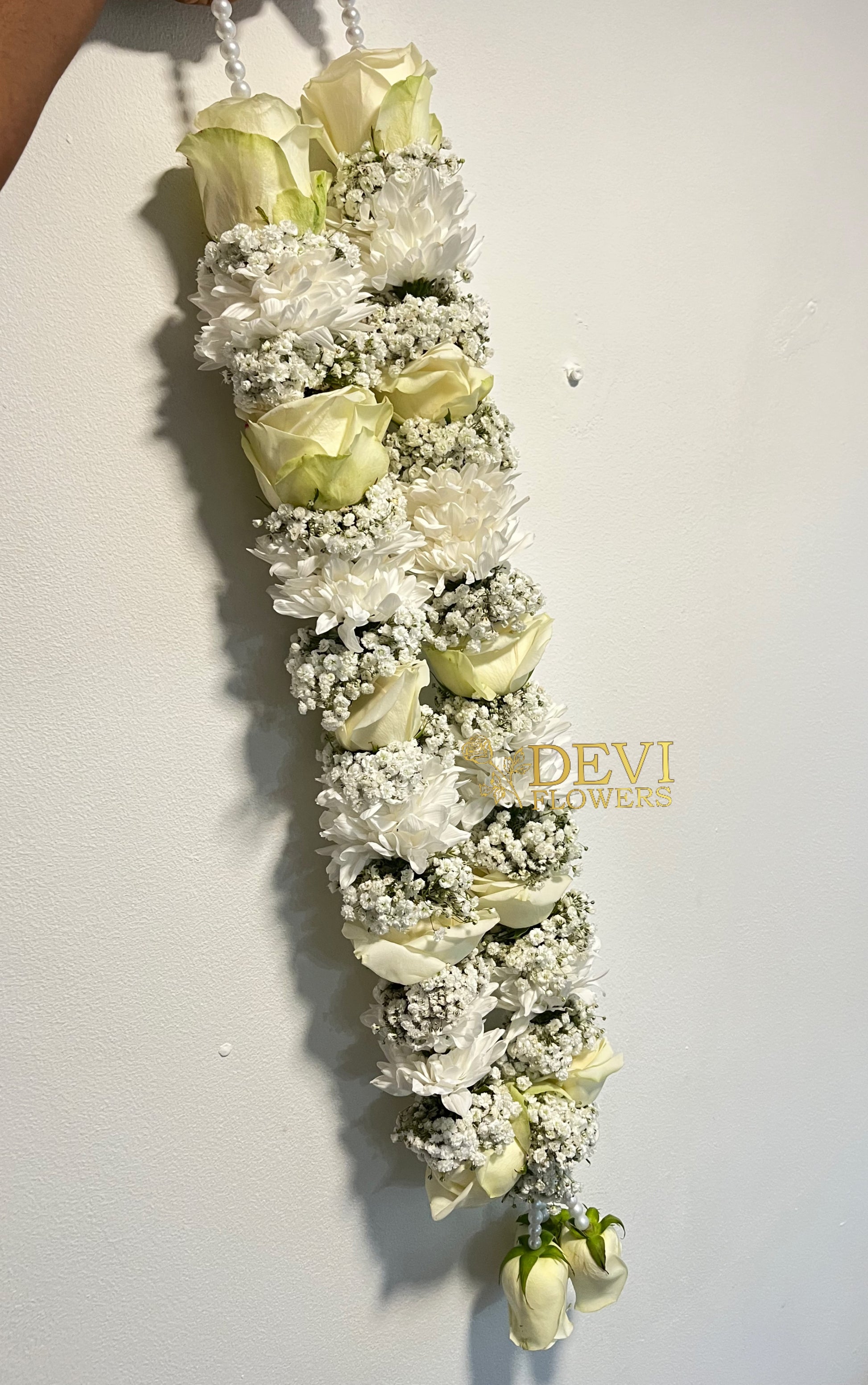 Gracefully hand-tied garlands featuring a refined mix of ivory roses, chrysanthemums, and gypsophila, designed to add timeless elegance to your bridal ensemble.