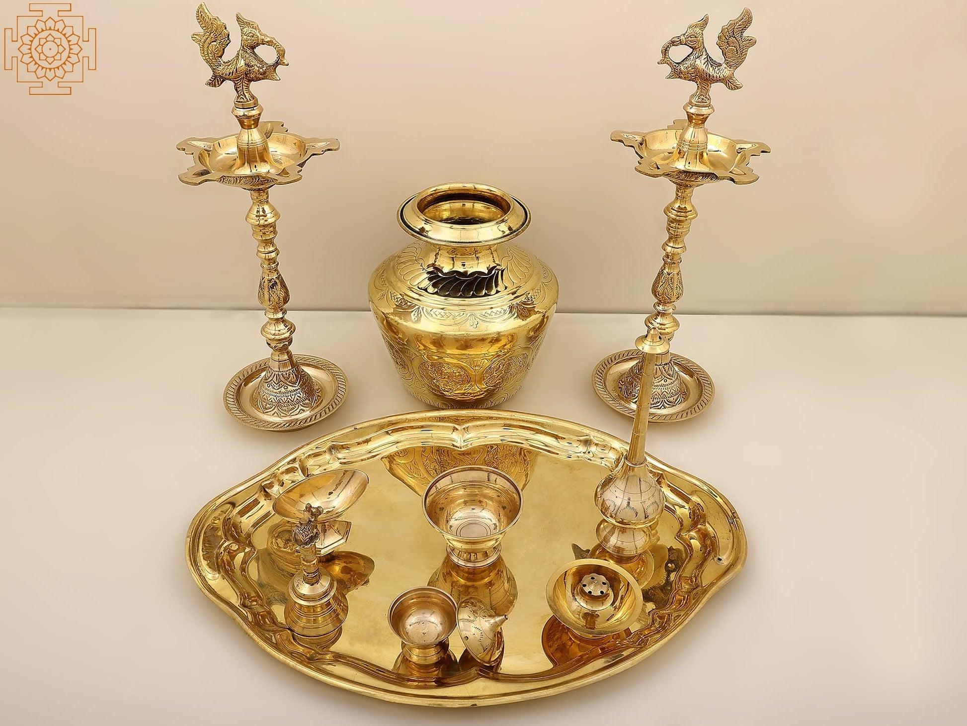 The Wedding Kumbam Set is a traditional, large gold collection including all essential pooja items required for weddings and home rituals. If you prefer a silver-colored set, please contact us.