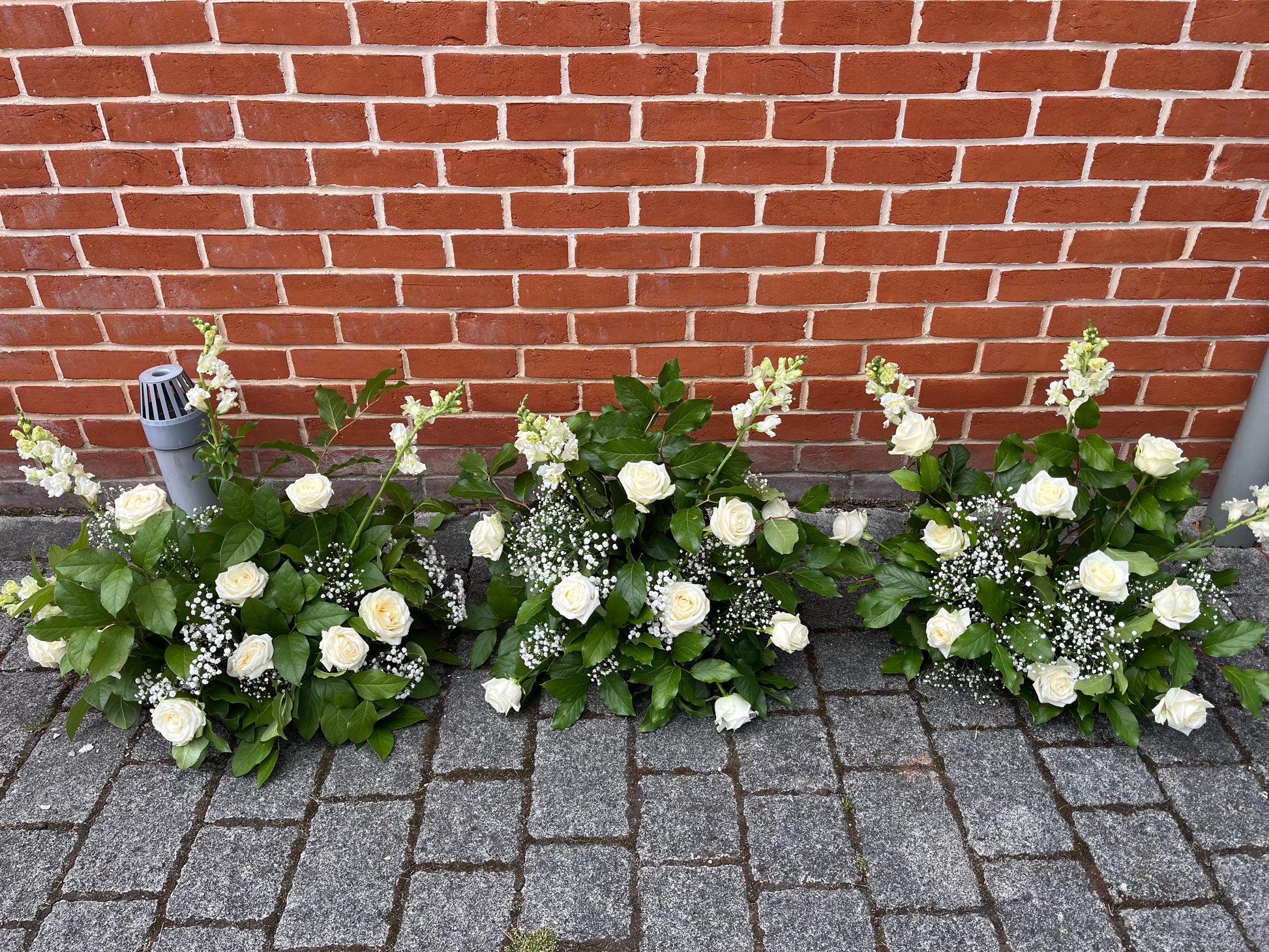 Elegant church floral arrangements showcasing white roses complemented by a selection of seasonal green foliage.